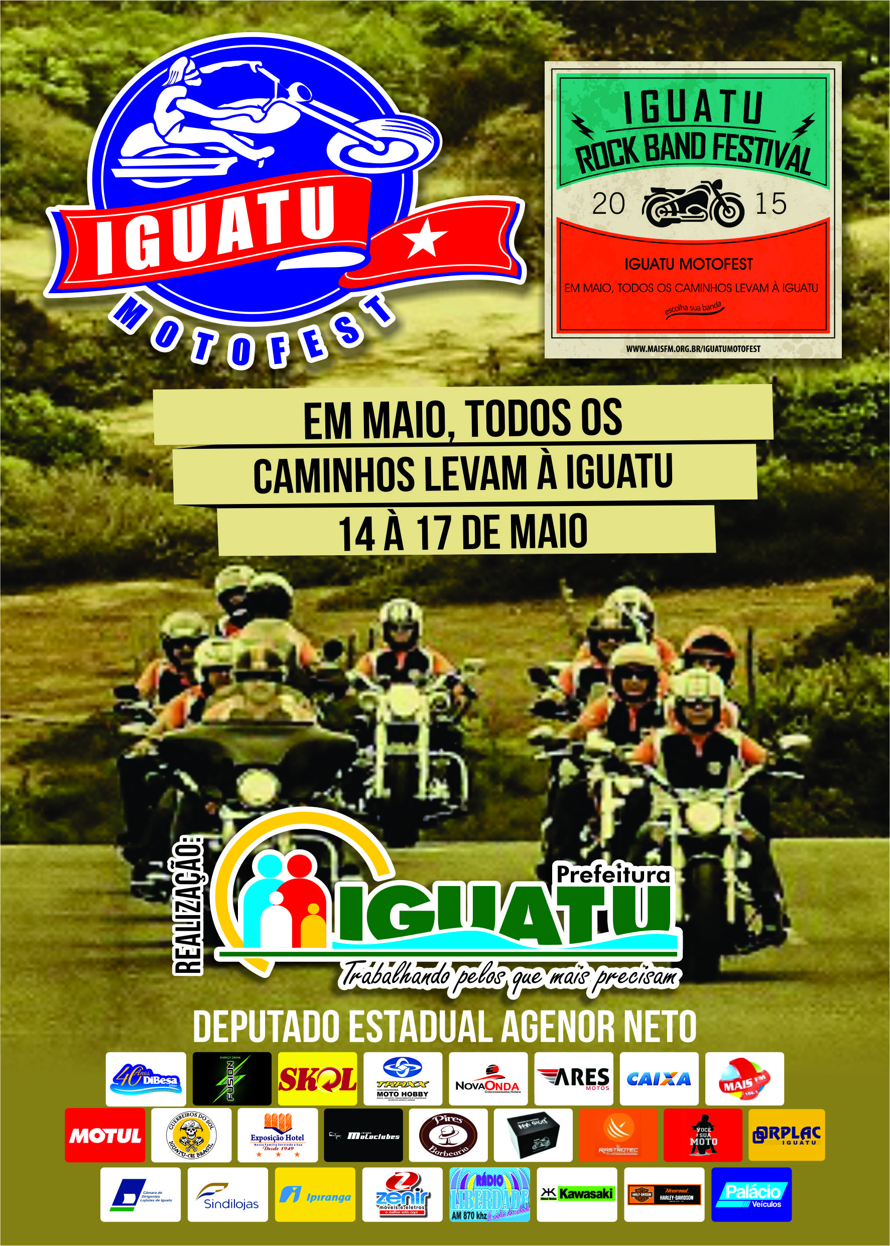 Iguatu Motofest 2015Iguatu. Estado: Ceará. Região: Nordeste. Latitude: 06º 21′ 34″ S Longitude: 39º 17′ 55″ W. População: 96.500 habitantes. Localizado literalmente no coração do Estado. Em maio, todos os caminhos levaram até lá, por conta do Iguatu Motofest 2015 que aconteceu de 14 a 17 e este ano foi sucesso total! O evento registrou hum mil  e cem motocicletas, com a presença de duzentos e vinte grupos de motociclistas – entre motoclubes, motogrupos e confrarias, vindos do Nordeste e de outros estados brasileiros e até do Chile; movimentou R$ 1,3 milhão nesta terceira edição, num crescimento  impactante no município, em relação aos dois anos anteriores, quando ano passado foi de R$ 800 mil e em 2013 foi de R$400 mil.