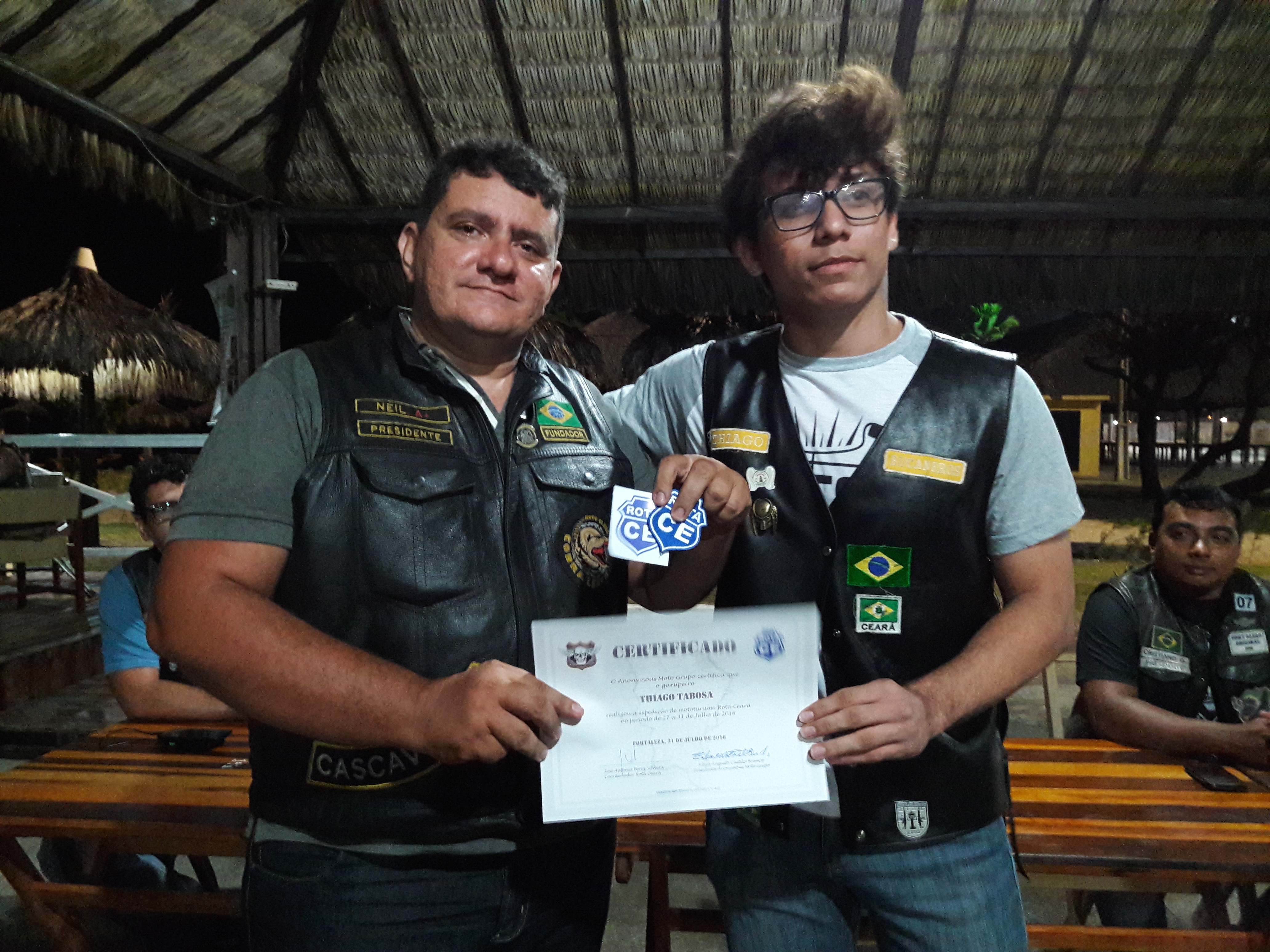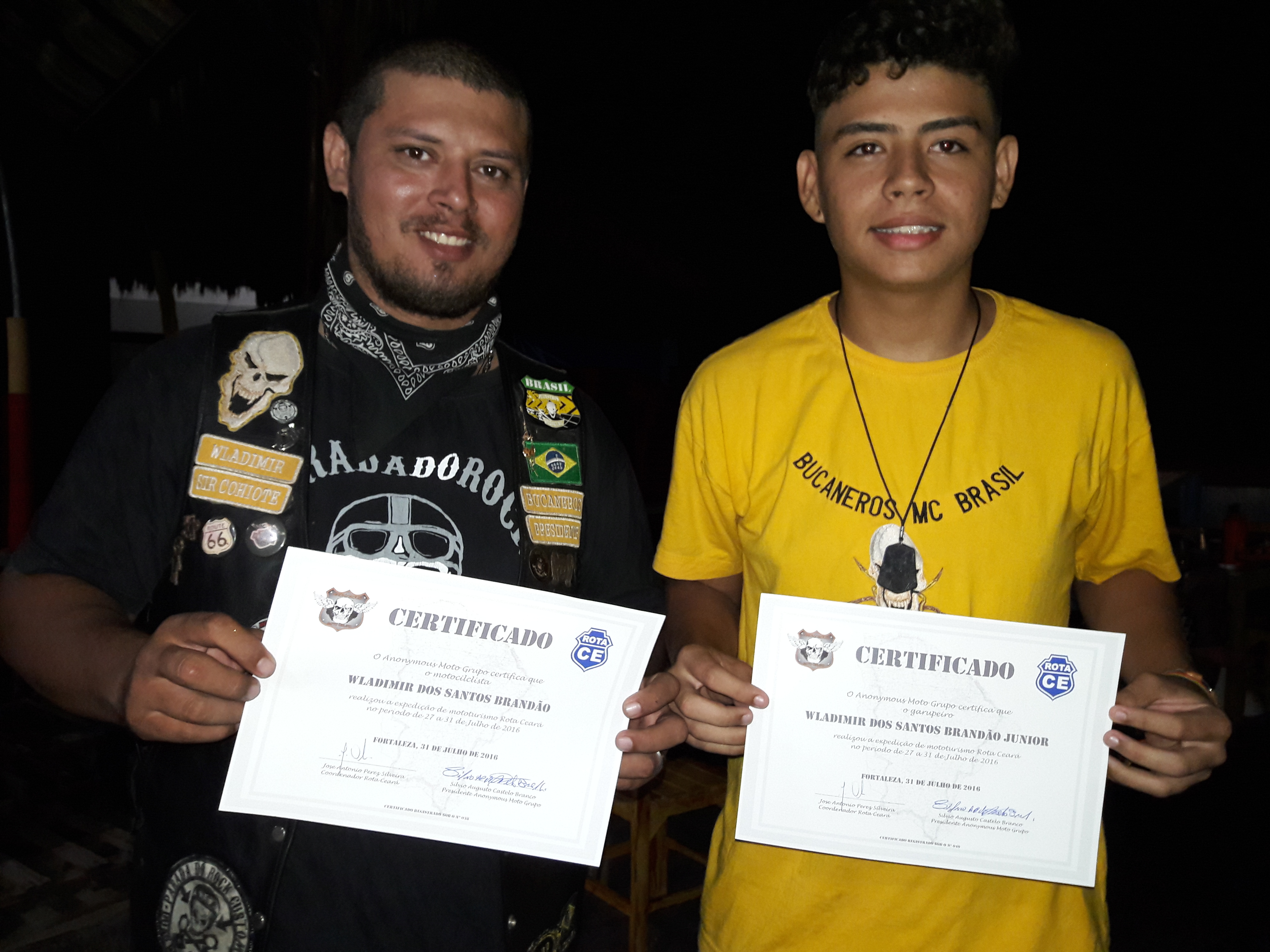 Na última terça feira, 2 de agosto, o Anonymous Moto Grupo entregou os certificados de comprovação de realização da 6ª edição do Rota CE aos integrantes do Bucaneros Moto Clube: presidente Wladimir Brandão; relações públicas Wisley Tabosa e aos seu filhos, respectivamente, Wladimir Brandão Junior e Thiago Tabosa, que foram os garupas na viagem.