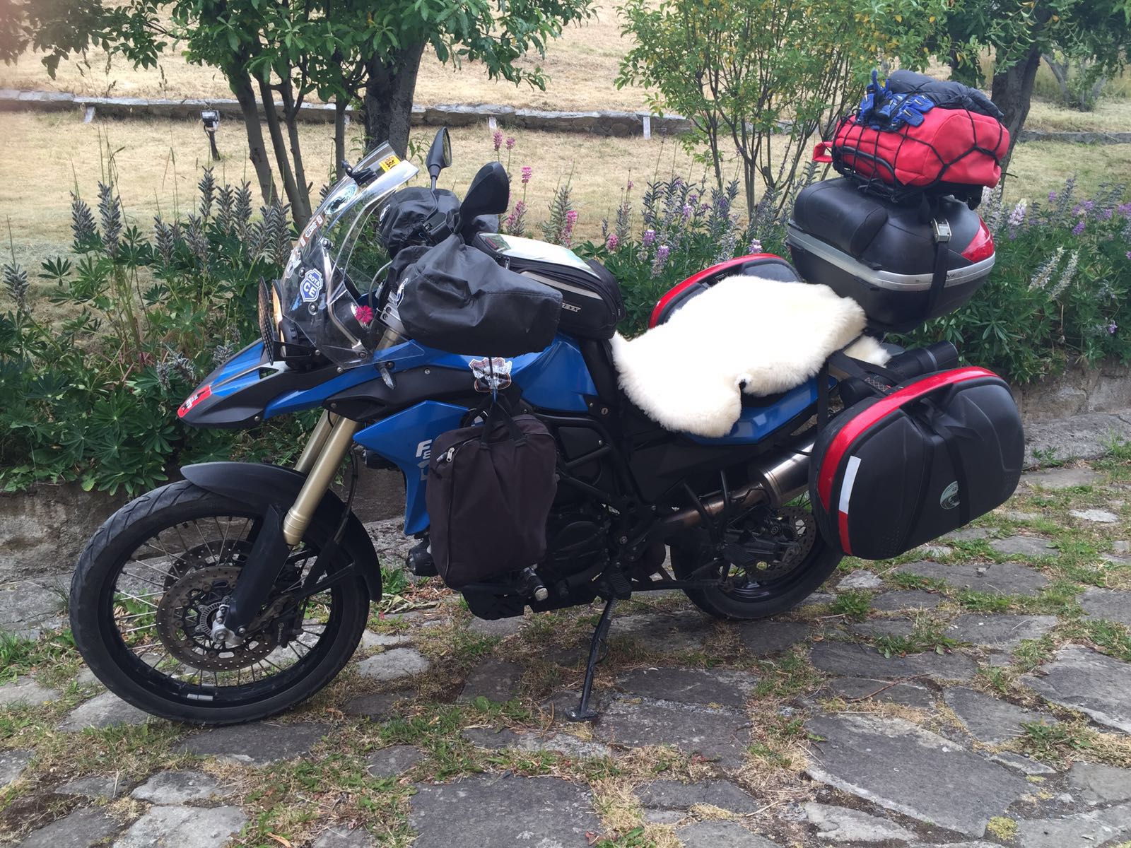 Muitas flores acompanhando a viagem! Compramos um pelego para o banco da moto. Nosso amigo Eduardo Hilgert tinha dito que era bem confortável e é verdade! Além disso ficou super charmosa!